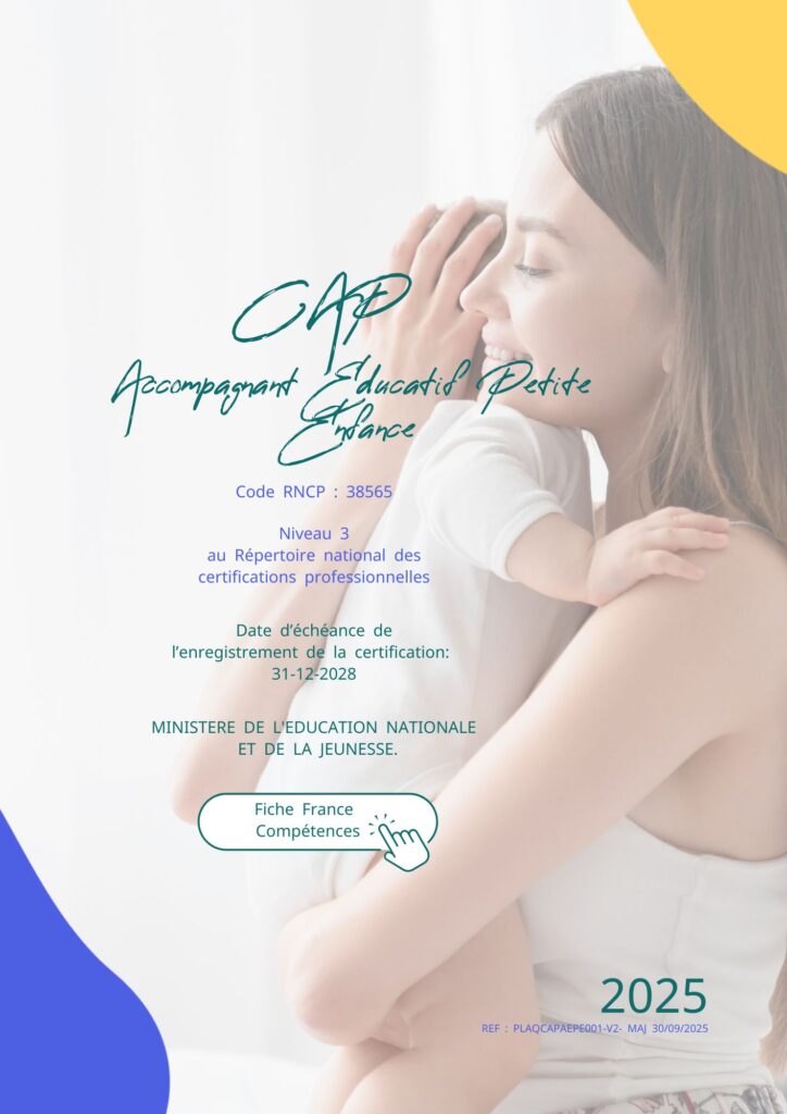 Le CAP Accompagnant Éducatif Petite Enfance représente le premier niveau de qualification dans le secteur de la petite enfance. Le titulaire de ce diplôme est un professionnel qualifié qui exerce ses activités auprès des enfants de moins de six ans, en veillant en permanence au respect de leurs besoins, de leurs droits et de leur individualité.